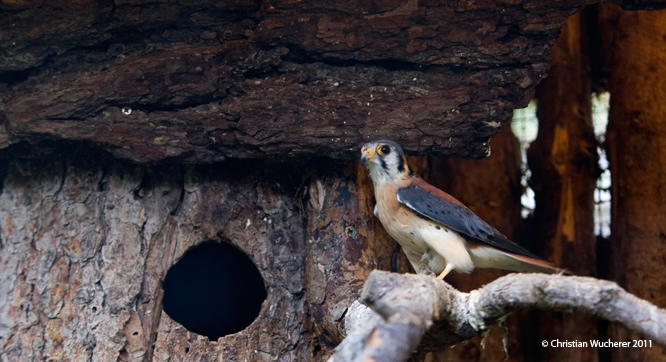 Der Buntfalke zählt zu den kleinsten Falkenarten und ähnelt in Aussehen und Jagdverhalten dem Turmfalken: Wie dieser jagt der Buntfalke seine Beute im "Rüttelflug", bei dem er mittels schneller Flügelbewegungen in der Luft regelrecht stehenbleibt. Auch jagt er gerne von einem Ansitz aus. Männliche Buntfalken erkennt man an ihrem Gefieder mit seinen prächtigen, rostroten Federn an der Oberseite von Rumpf und Schwanz.
